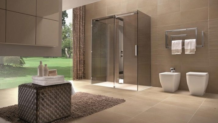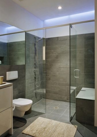 - Els envans de vidre es combinen amb èxit amb el terra i les parets, dissenyats en colors foscos amb imitació de maçoneria. És molt estèticament agradable quan un gran espai de rentat estigui ben tancat per una porta basculant.