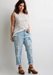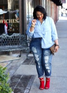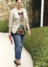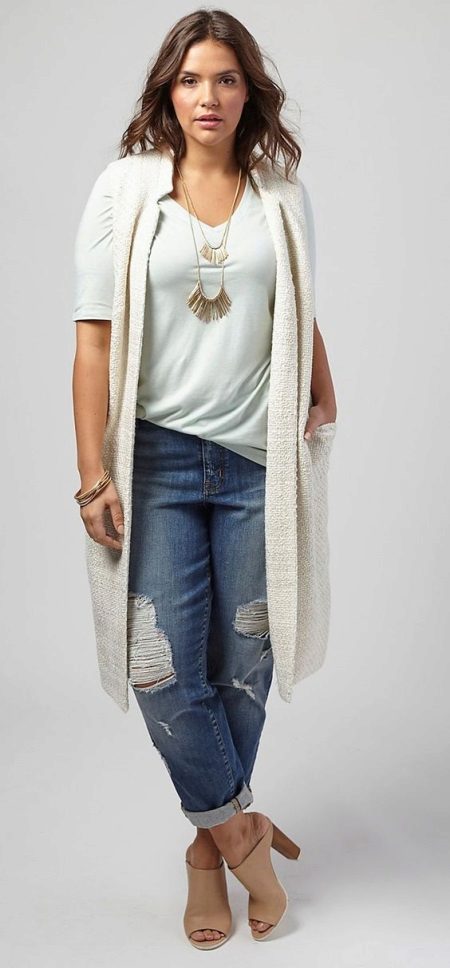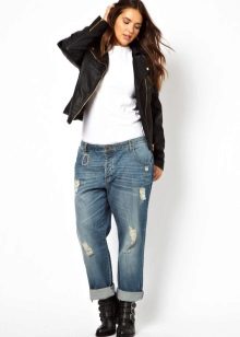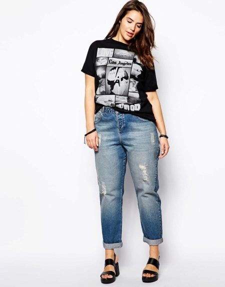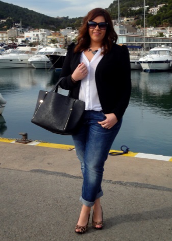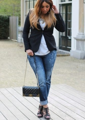 Les nenes amb formes corbes han de portar texans de nòvio en combinació amb samarretes o samarretes, mentre que l'elecció del color és individual. Aquest estil té un aspecte harmoniós amb samarretes de denim, cardigans, cardigans, túniques i jaquetes. Molt eficaç és la combinació de texans nuvis amb jaqueta de cuir.