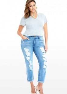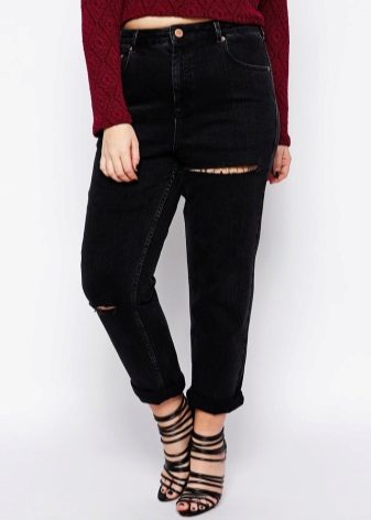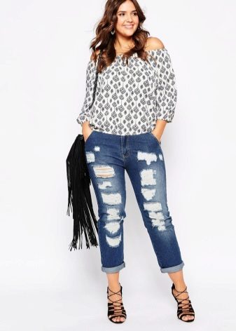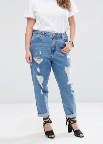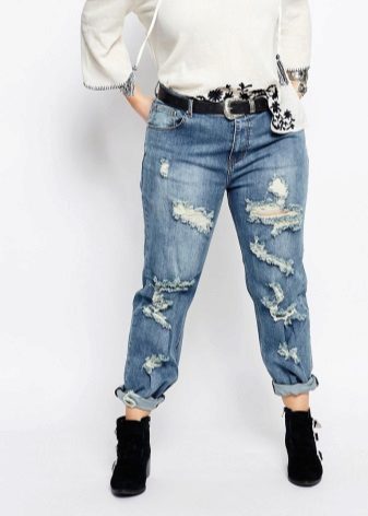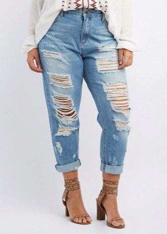 Els joves prefereixen els models esquinçats, perquè els forats als texans donen la imatge de l’encant d’un hooligan. Les nenes exuberants haurien d’evitar forats grossos que mostren les cames completes i que afegeixen molèsties a la imatge.