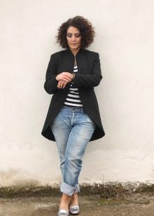 Com que els texans de nòvio tenen un tall similar al dels homes, es poden combinar amb sabates d’home. Per exemple, aquest estil té un aspecte elegant amb sabatilles, sabatilles, mocassins i botes. Però heu d’anar amb compte amb aquesta combinació, perquè omple visualment la figura.