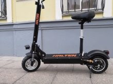 - Halten 1200W. El patinet elèctric City de disseny i seient dinàmic, és lleuger - pesa només 28 kg, té una mida de calibre de 10,5 ″, està equipat amb frens de disc. El model és capaç de velocitats de fins a 50 km / h, la reserva de potència és suficient per 70 km de via. El patinet elèctric pot suportar càrregues de fins a 150 kg. El kit inclou un velocímetre, un pas, un amortidor a la roda del davant i un suport per a aparells.