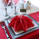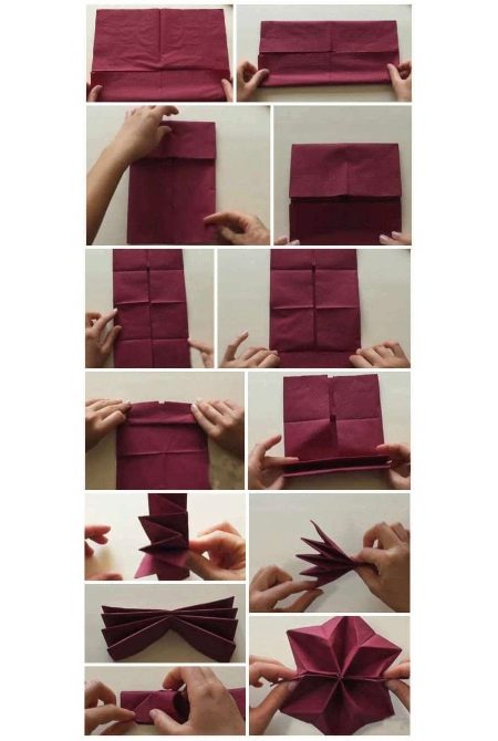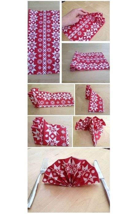 Aquest mètode de plegament és ideal per a esdeveniments d’hivern, especialment per a festes de Cap d’Any. Si utilitzeu productes multicolors, podeu obtenir una decoració molt atractiva.