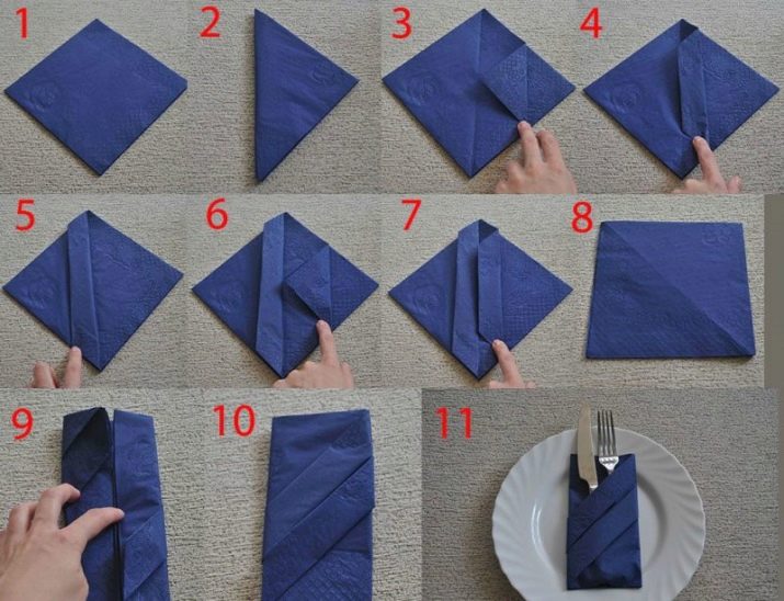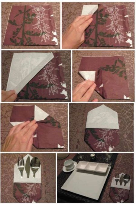 Aquest tovalló plegable és adequat per a la configuració de taula clàssica. Amb un sobre francès, podeu decorar tant un sopar de gala com un sopar casolà. La instrucció és senzilla: