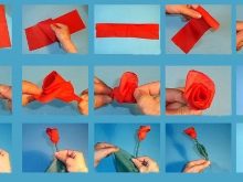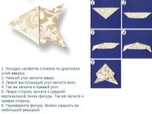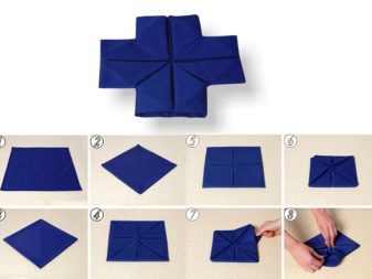 La instrucció pas a pas és la següent: de manera que la figura resulti ser la part frontal, s'ha de posar el teixit per dins. Doblegueu les cantonades cap al centre. Gireu el quadrat resultant i tireu les cantonades cap al centre. Gireu i doblegueu de nou les vores. Apunta amb el final molt agut, obtens un rombe. Tireu el cantó dret perquè surti fora, feu el mateix amb els altres racons. Allisar amb cura les figures amb les mans.