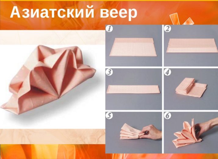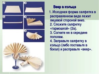 El teixit es plega fins que surti una tira de quatre centímetres d’amplada. El tovalló es plega al llarg de la banda amb un acordió, es fixa a la base i es desplega amb un bon ventilador. Els clients quedaran gratament sorpresos si la taula està tan refinada.