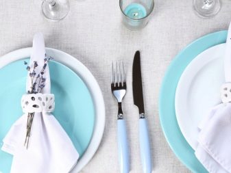 - Un tema important de la configuració de la taula és un porta-tovallons. Els tovallons de paper s’instal·len per a ús general, els tovallons tèxtils estan al costat de cada plat. Tenen finalitats diferents. El primer ajuda a mantenir netes les mans i els llavis durant el sopar, mentre que el segon té cura de la roba: es tapen els genolls.