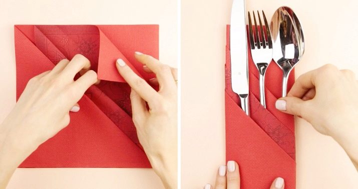 Coberts o flors plegades tenen bon aspecte a les butxaques de tovallons tèxtils. Faciliteu-los. El tovalló de tela per mètode de plegament ha de dividir-se en quatre quadrats iguals, fixar els llocs de plegat amb el ferro i desplegar-lo de nou. Tireu la cantonada de la casella inferior esquerra cap al centre. Feu el mateix amb la cantonada superior dreta, però no aprofundeixis