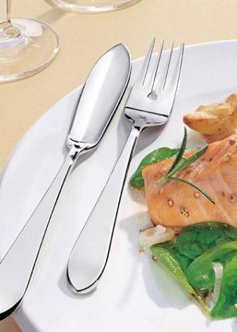 Els dispositius per a plats de peix són especials: una forma especial d’un ganivet que s’assembla a una escàpula (especialment convenient per tallar i separar ossos) i una forquilla amb claus més curts.