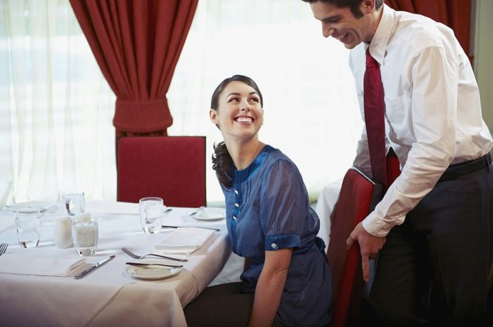 L'aterratge és el següent: un home sempre ofereix a la dona un lloc de desembarcament més rendible, per exemple, amb vista a través d'una finestra o a l'escenari, si la nit implica un acompanyament musical. Empenyent una de les cadires, convida la dama a seure. Un cop establert-vos a la taula reservada i havent estudiat el menú presentat, heu de realitzar una comanda.