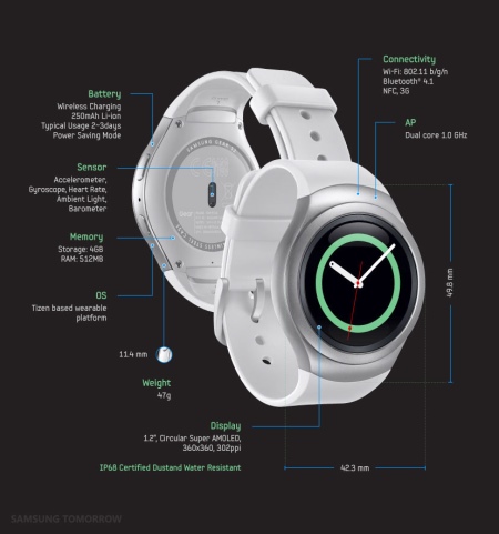 Samsung va agafar la moda per a accessoris "intel·ligents" i va llançar una polsera Gear S2 inusual, que alhora actua com a rellotge amb un dial independent, suport per a telèfons intel·ligents i com a accessori fitness amb un potent sistema operatiu.