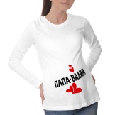 "A la panxa està ocupat". Una altra inscripció dolça i emotiva que s'utilitza sovint per dissenyar aquestes samarretes. La inscripció pot anar acompanyada d’una imatge divertida que representa els talons i els palmells d’un nadó, un rostre divertit o el petit.