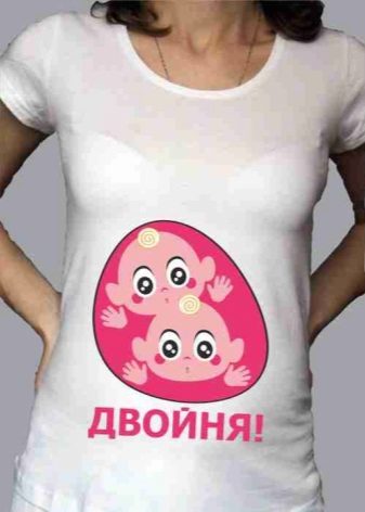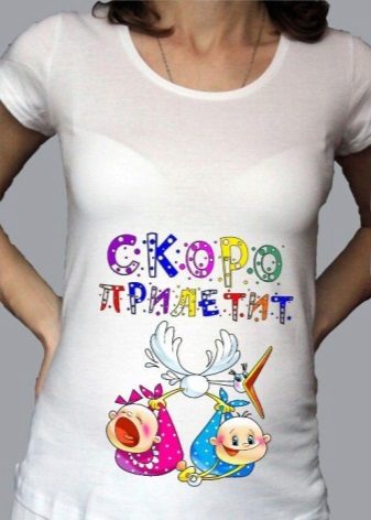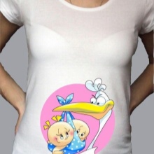 Samarretes per a mares en espera que esperen bessons. Aquestes samarretes sovint representen una cigonya que portava dues bossetes amb els nadons. Una altra opció: dues cares dels nens sobre un fons brillant amb la inscripció "bessons". Aquesta pot ser una imatge de dos cors de color blau i rosa.