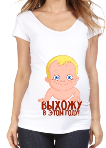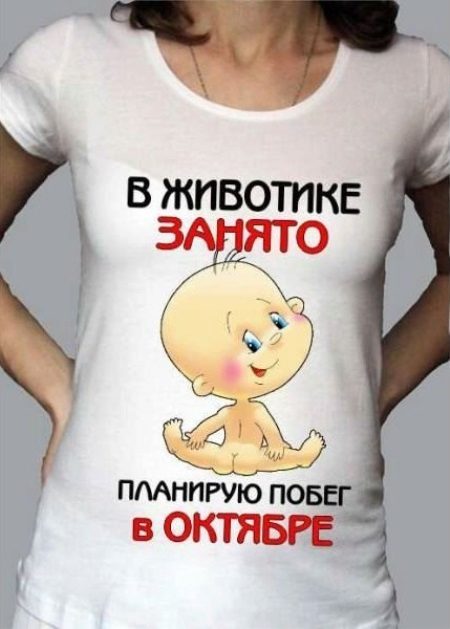 Samarreta amb les paraules "Jo penso escapar!". Aquesta inscripció sovint es complementa fins i tot amb el nom del mes en què s'espera el naixement del fill, per exemple, "penso escapar a l'agost!" De vegades s’afegeix una imatge que representa l’època de l’any quan hauria de néixer el nadó. La inscripció sovint es realitza en el fons de la imatge d'un nadó que mira amb ulls aguts.