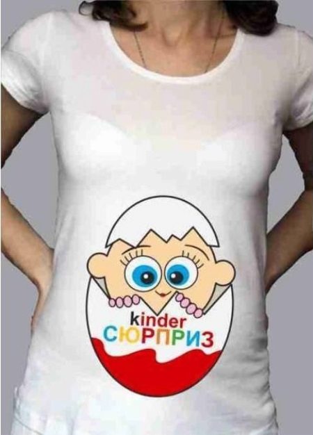 Sorpresa Kinder. Una altra opció popular per a samarretes per a mares expectants. Les samarretes amb inscripcions neutres solen ser escollides per dones que encara no coneixen el gènere del nadó. La inscripció pot anar acompanyada d’un quadre temàtic, dibuixant una analogia amb un dolç, popular i estimat pels nens. Només en lloc d'una joguina d'un ou de xocolata, la cara del nadó surt a la vista.