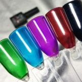 - Ull de gat - Una gamma buscada, la bellesa de la qual es manifesta el màxim possible en mans de professionals. El recobriment brilla exclusivament gràcies a les partícules metàl·liques de la composició. La peculiaritat d’aquest producte rau en la seva reacció davant d’un imant, que forma un bell patró en xavac.