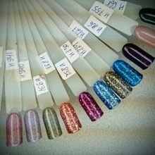 L'art de les ungles amb brillantor en tons 116, 127, 276 o 416 ajudarà a brillar a la imatge d'una diva secular. No 027: una ombra de pruna molt pigmentada i densa amb micro-espurneres, 095 - pruna fosca amb un brillantor. I per a una manicura més neutra, és adequat el número 037: sorra amb purpurina.