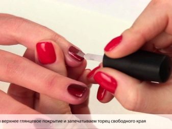 - Cobert superior. S’aplica més gruixut que les capes de color anteriors. Assecar durant 3 minuts sota una làmpada UV i 60 segons a la llum d’una llum LED. Està disponible un acabat mat o brillant. Després d’aplicar la part superior amb una capa enganxosa, el recobriment es tracta amb una solució que conté alcohol amb un drap sense nap. Normalment, una part superior s'utilitza per fixar el revestiment de colors amb ungles per millorar l'adherència de les capes. I sense una imatge, n’hi ha prou amb arreglar el xavall amb un acabat ordinari.