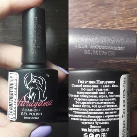 El poliment de gel Haruyama està disponible en ampolles de 8 ml de color negre. Es caracteritza per hipoalergenicitat, densitat i plasticitat del recobriment. A diferència dels vernissos habituals, el gel no s’asseca sense assecar-se en una làmpada especial, cosa que permet aplicar-la uniformement i lentament a la superfície de les ungles.