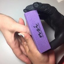 - En un primer moment, cal preparar la placa d’ungles per al recobriment. Per fer-ho, a petició del client, podeu fer una manicura de retall o de maquinari. Assegureu-vos de tractar les mans amb un antisèptic i presteu atenció a la neteja del platí de l’ungla, traieu el brillant de l’ungla viva amb un tampó per a una millor adhesió al material artificial. Els polits de gel Kodi permeten un lleuger tractament de l’ungla, però és millor no deixar de banda aquest procediment per tal d’evitar més despreniments del material.