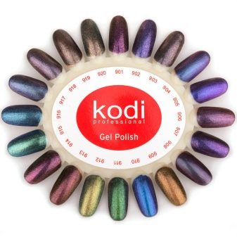 Tota la gamma de colors i ombres del vernís tenen els seus nombres i nombres. A més, Kodi Professional ha desenvolupat línies en sèrie de polits de gel: ulls de gat, magnètics, vernissos tèrmics i amb espurnes. La paleta de només cinc vernissos de gel per a ulls de gat va excitar la demanda del mercat de les indústries de les ungles. La seva particularitat rau en el fet que gràcies al pigment reflectant afegit, el vernís dels desbordaments s’assembla a un joc del color de la pedra natural amb el mateix nom. Aquesta línia de vernissos ha guanyat milers de seguidors.