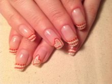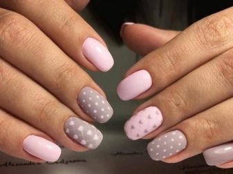 Sobre una base transparent a través d’una ungla, apliqueu un gel rosat, i sobre els dits restants - blanc. Asseca't sota la làmpada i repeteix la segona capa. Després, sobre un fons blanc amb punts, dibuixem cors rosats de mida petita. Per fer-ho, poseu dos punts al costat i connecteu-los cap a baix en un angle recte. Així doncs, dibuixem a cada dit diversos cors petits en direccions diferents. Fem el mateix sobre un fons rosat en blanc. No oblideu assecar el recobriment i tapar-lo bé per obtenir una durabilitat amb la part superior.