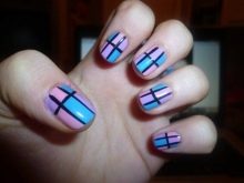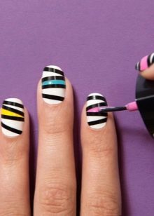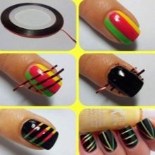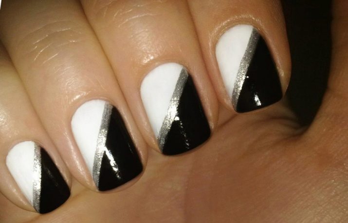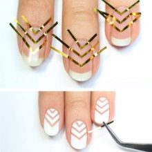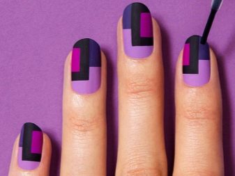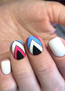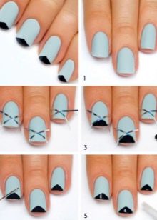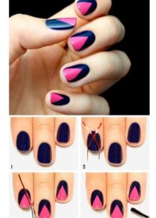 La geometria ha estat popular durant més d'una temporada en totes les tècniques i tipus de recobriments d'ungles. Aquest disseny sembla molt de moda. I fer-ho amb els vostres dits és força fàcil amb cinta adhesiva o maquinetes. Necessiteu vernissos de dos o tres colors contrastats i un pinzell.