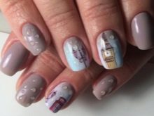 No és difícil en absolut crear una manicura atractiva amb decoració. Per fer-ho, necessiteu petits adhesius, strass i purpurina transparent. Apliquem adhesius amb el disseny seleccionat a la capa base. Es recomana posar-los al costat de l’ungla o a la base. És millor decorar els dits petits, índex i dit mig. A continuació, apliquem purpurina transparent a la part superior dels adhesius, hi hauria poques partícules brillants. Sobre els dits d’accent: l’anell i el dit petit a la base de l’ungla a prop de la lunula, cola uns quants strass sobre la purpurina encara enganxosa. Asseca la manicura sota la làmpada i cobreix-la amb una part superior transparent.