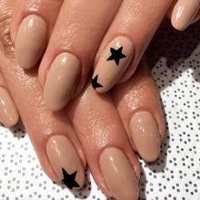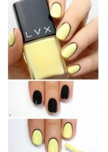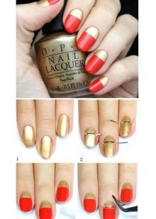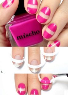 Si s’utilitza una ombra força brillant per a la manicura, podeu provar la tècnica negativa de la moda de l’espai. Per realitzar-lo, necessitareu cinta o stencils. La línia de fons és que la part de l’ungla queda sense pintar. Normalment, la lluna es deixa sense tocar pel gel.