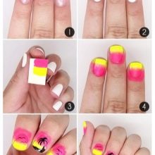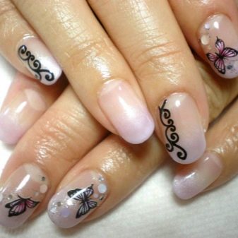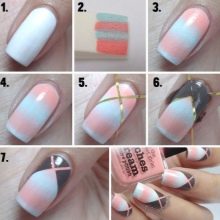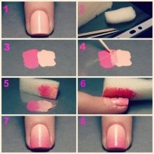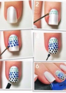 Gradient: un patró molt popular i delicat, que consisteix en que flueixin flors entre si. Pot ser llisa (ombre) o cruixent, fins i tot geomètrica, formada per les mateixes ratlles o formes de diferents colors. La tecnologia moderna dóna un ampli vol d’imaginació. Podeu combinar no només els tons d’un sol to, sinó també els colors més vius.
