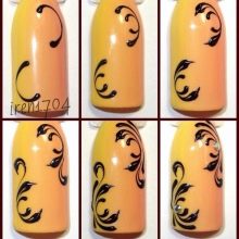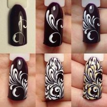 La majoria dels dibuixos més complexos, si es consideren bé, es basen en una combinació d’elements ordinaris: punts, comes, línies rectes. Realitzar-los és fàcil. Per obtenir un patró adequat, podeu utilitzar punts, cinta escocesa, plantilles. A l’hora d’aplicar, val la pena controlar detingudament la quantitat de pigment recollit a l’eina de manera que no en quedi gaire.
