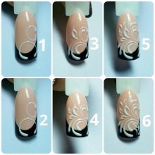 Els monogrames són un altre patró popular que adorna molts tipus de manicura des del francès quotidià fins a les noces de luxe. Per crear-lo, necessiteu un pinzell, punts o un escuradents ordinari, bolígraf. Es posa un punt en color contrastat al vernís principal, una coma es treu. La següent part de l’ornament es fa de la mateixa manera. Podeu posar rínxols de diferents mides i deixar-los en diferents direccions. Creen un ornament luxós o una decoració floral.