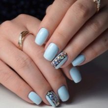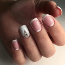 Una manicura simple simple amb un color de moda sembla atractiu. Si el complementeu amb petits accents de moda, obteniu un disseny únic. Així, podeu dibuixar un forat de color contrastant a la base de l’ungla o a la vora mitjançant la tècnica de la manicura francesa. Podeu fer ombra a totes les ungles o només accent.Si s’afegeix una franja de pedra de tall al llarg de la vora de la lunula o fins i tot al costat de l’ungla, resultarà atractiu.