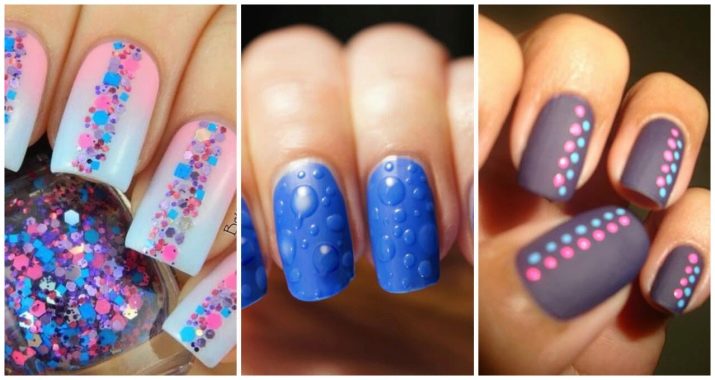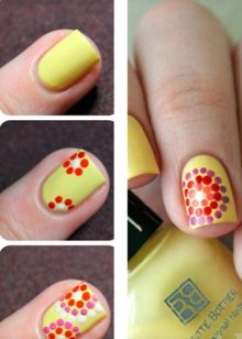 Els cercles constitueixen la base de molts patrons i patrons complexos. Amb la seva ajuda, podeu fer qualsevol patró, batre motius nacionals, diverses textures, crear un patró floral o monogrames enganxosos. Fins i tot uns quants punts de color contrastat, posats a la base de l’ungla, posaran de moda l’habitual recobriment monocrom. Eterna clàssica: els lunars també consisteixen en cercles i punts de diferents mides. Sequins i kamifubuki: una versió de moda de la manicura del club nocturn en cercles. A partir dels punts podeu crear qualsevol patró: papallona, animal, sol, marieta.