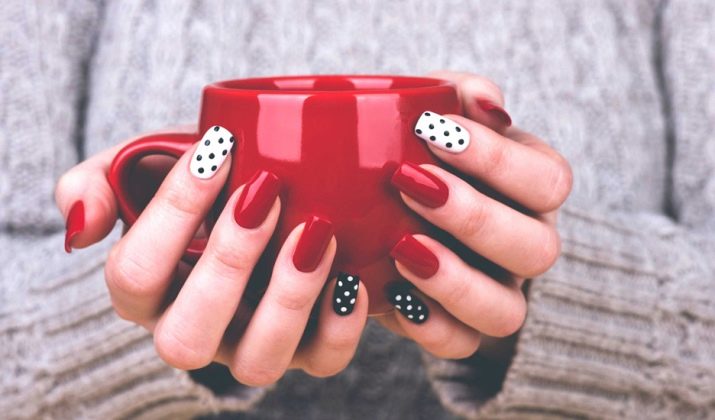 - El vermell clàssic sempre sembla luxós, fins i tot en monocrom. Complementat amb pèsols en altres dos colors populars, converteix una manicura senzilla en un estil retro i sofisticat. Se us presta atenció.