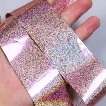 - Transferible. El paper també està disponible en rotlles, que s'envasen en envasos de plàstic, cosa que augmenta la fiabilitat de l'emmagatzematge. Per les seves característiques, aquest material és adequat per a principiants, així com per a crear manicura bricolatge. Els fabricants ofereixen un gran assortiment, hi ha molts colors, les textures són diferents. A més, alguns tipus tenen calcomanies o patrons. Degut a un determinat mètode d’aplicació, la làmina va obtenir el seu nom: el material s’aplica a l’ungla tractada amb cola, es suavitza, i després s’elimina el substrat, deixant una capa decorativa a la placa de l’ungla.