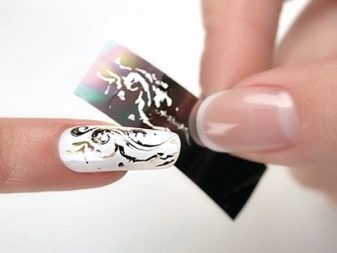 - Pegatines - La versió més fàcil del full de transferència. En aquest cas, la imatge ja ha estat creada per complet pels artistes, només queda eliminar el substrat i enganxar amb cura la imatge amb una capa adhesiva a la superfície de l’ungla.