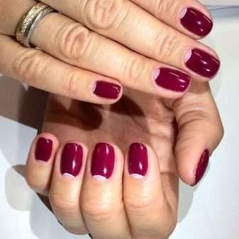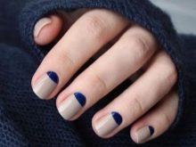 A més, aquesta opció de manicura està en perfecta harmonia amb les últimes novetats entre els materials per a la decoració de les ungles. Durant la pintura d’ungles, s’utilitzen vernissos de gel mat, adhesius, així com la combinació de dos o més estils, cosa que permet considerar la manicura lunar com l’opció de disseny més exitosa i universal.