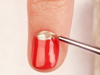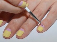 - Després de crear una base de colors a les ungles, heu d'utilitzar un pinzell per dibuixar un "somriure" a la base, fent el dibuix amb cura i lentament perquè tots els forats siguin iguals. A continuació, cal assecar les ungles en una làmpada.