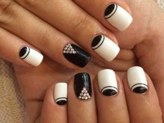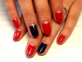 - El disseny es classifica en funció de la paleta de colors dels vernissos utilitzats, així com de materials decoratius addicionals.Durant la manicura, es poden fer servir pedres de pedra, pols, així com làmina i diversos altres materials per decorar els forats de les ungles. A més, escollint la combinació amb més èxit de dos colors, podeu dissenyar en qualsevol esquema de colors. La tasca principal en la selecció de tons és el seu contrast entre ells.