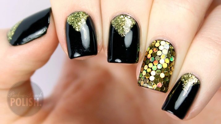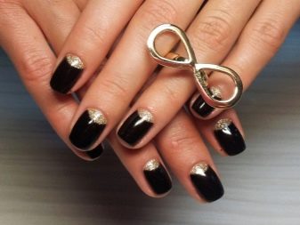 Per als esdeveniments festius, una combinació d'or brillant i negre brillant serà una opció de luxe per a la manicura lunar. Aquest disseny d'ungles és perfecte per a qualsevol aspecte i vestuari escollit, i el parpelleig d'or emfatitzarà la bellesa i posarà un estat festiu.