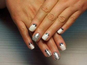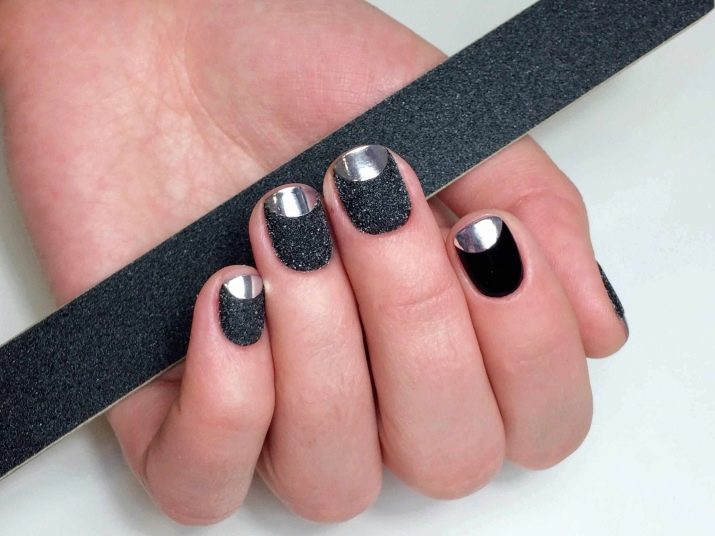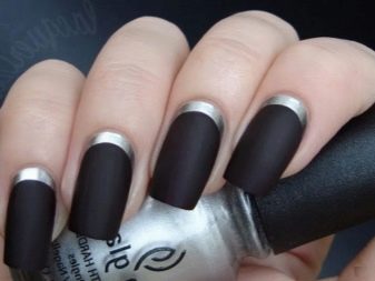 Per a aquells que prefereixin mantenir-se sempre en tendència, a l’hora d’escollir una manicura lunar per a qualsevol ocasió, val la pena preferir una composició amb decoració d’acer metàl·lic per a l’ungla, on la pols de vellut gris serà el color base. Es fa un accent sobre un dit, de color negre mat.
