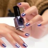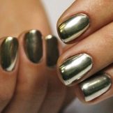 Per obtenir una brillantor del mirall, un fregament també és un bon ajust. Es tracta d’una pols fina amb partícules metàl·liques que, quan s’aplica, penetren al vernís i li donen un brillantor sorprenentment suau. Aquest mètode també és bo perquè l’elecció del color principal de la manicura es simplifica.