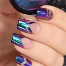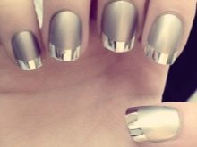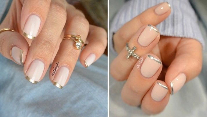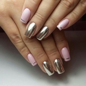 Aquest tipus de recobriment crea combinacions úniques amb altres tipus de manicura. Per tant, s'utilitza activament com a detall brillant del disseny lunar. Un petit mirall semicercle a la base de l’ungla o a la seva punta crida immediatament l’atenció. Però a l’hora de decorar, cal recordar que el metàl·lic s’adapta millor als colors freds i és millor complementar tons càlids amb or.