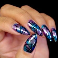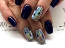 L’estil geomètric de tendència proporciona un gran camp per a l’activitat creativa. Aquí podeu combinar no només un recobriment de miralls amb vernís normal, sinó també afegir textures mat. Aquestes figures geomètriques en una superfície brillant (si es tria la capa de mirall com a base) semblen expressives i inusuals.