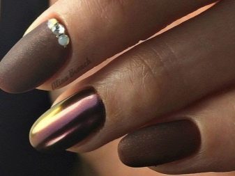 Però les decisions de disseny dels especialistes en art per a ungles no només inclouen les superfícies més reflectants.També és molt agradable crear un brillo moderat amb una petita quantitat de fregament. El més beneficiós és una lluentor tan suau quan es pinta no tota la mà en metall, sinó només unes ungles. Els dits restants es poden decorar amb un color diferent, a més de complementar-se amb strass, si la imatge és de nit.