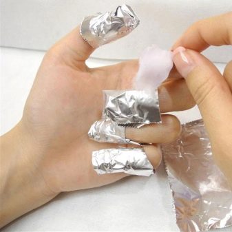 - El primer d’ells implica l’ús de compreses. Per fer-ho, s’aplica un remover de vernís al coixí de cotó. El disc s’ha de col·locar a la placa de les ungles. A continuació, s’aplica una làmina sobre el disc, que s’embolica al voltant del dit amb un con per crear un efecte hivernacle. Podeu substituir el paper amb clips especials. Mantenir aquest disseny hauria de tenir aproximadament un quart d’hora.