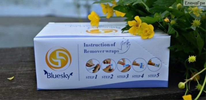 Accessoris de retirada d'ungles Bluesky ben impregnat de la composició, que permet utilitzar un tovalló repetidament. Segons l’experiència d’alguns usuaris, l’ús de tovallons d’aquesta marca no requereix ni tan sols l’arxivament previ de la capa de vernís. Tot i això, el preu d’un producte tan miraculós és molt superior al dels anàlegs esmentats abans.