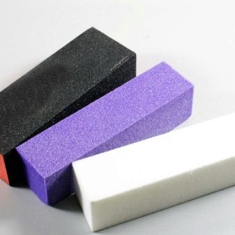 - Un fitxer dissenyat per ajustar-se capa superior o esmalt de gel a les ungles. S’ha de polir una capa forta de gel superior o vernís gel amb un fitxer especial d’ungles, l’abrasió del qual és de 160/180 gra. Aquest treball es realitza abans d’establir tot tipus de decoracions o en el procés d’eliminació de la capa abans del processament amb una composició especialitzada, de manera que el líquid més aviat faci la capa dura.