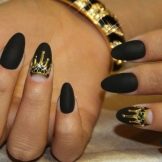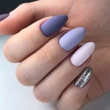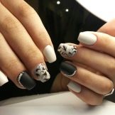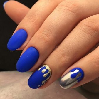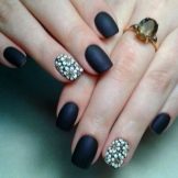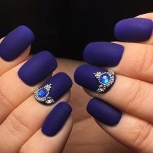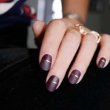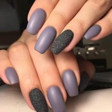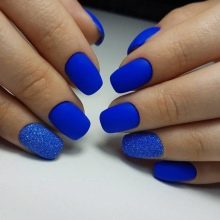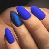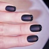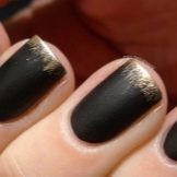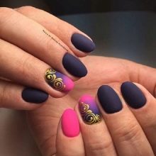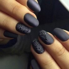 Acabat mat en negre profund, blau, morat, vi - Un camp ideal per a experiments de moda amb manicura. Aquí podeu utilitzar cinta de manicura per crear tires, paper de pantalla. No és menys impressionant la barreja d’un top brillant i mat amb la transició d’ombre a la punta de l’ungla. El gradient es crea mitjançant un pinzell especial, barrejant matisos a la paleta. Per obtenir el màxim efecte, el recobriment no s’utilitza sobre els cinc dits, sinó sobre un o dos claus, combinat amb solucions monocromes.