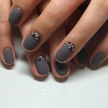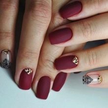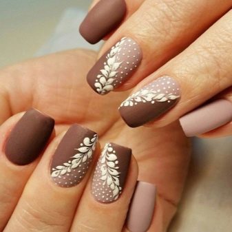 L’efecte mat té un aspecte excel·lent en combinació amb riques tonalitats de postres, picants i vins. Noble burgundy, moca i xocolata, tons de canyella o safrà semblen increïblement impressionants en una realització d’aquest tipus, són molt adequats per als propietaris d’un aspecte sofisticat i una pell fosca. Per a les rosses escandinaves, els experiments amb tapes mat també són força accessibles: es recomana provar per si mateixos la brillantor dels diamants i el sistema de colors assolellats de tons utilitzats per dissenyar la placa de les ungles.